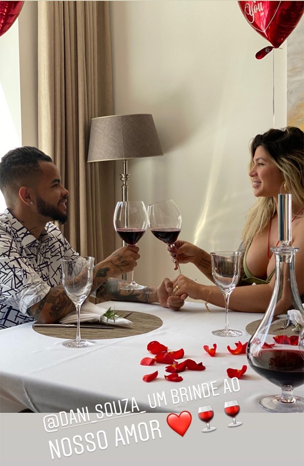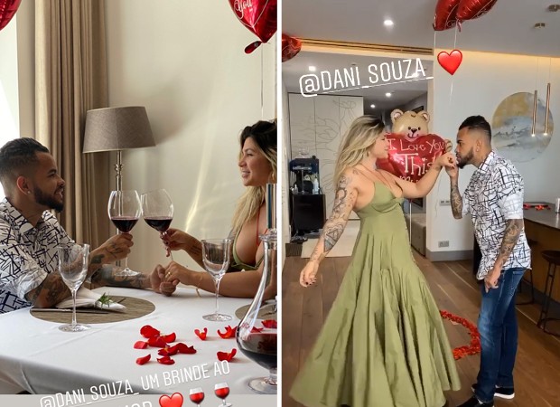 Nas imagens, os dois aparecem almoçando juntos em uma sala decorada com pétalas de rosa e balões (assista abaixo). Dani aparece elegante em um longo verde. Já Dentinho optou por jeans e uma camisa estilizada preto e branco.