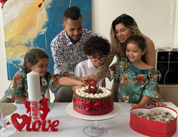 No Instagram, o jogador também publicou uma foto ao lado dos filhos. Eles aparecem cortando um bolo. "8 anos de muito amor!", escreveu ele.