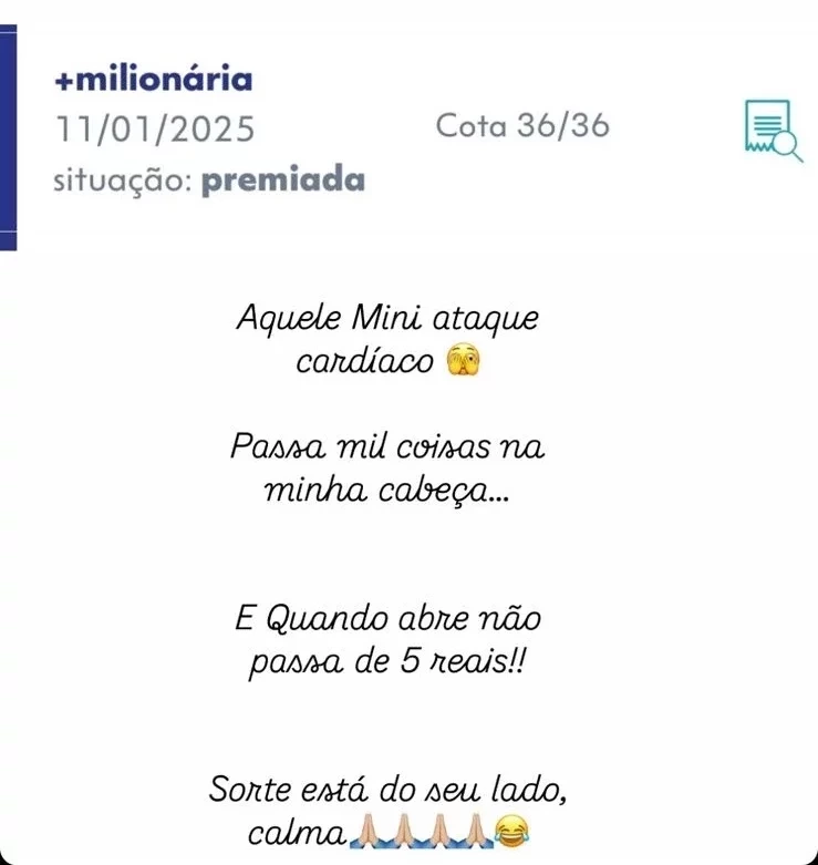 “Aquele Mini ataque cardíaco, passa mil coisas na minha cabeça, e quando abre não passa de 5 reais!! Sorte está do seu lado, calma”, brincou.