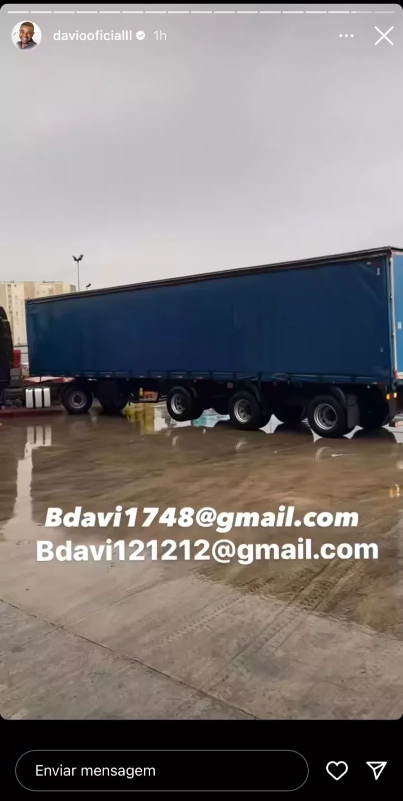 Davi em post no instagram mostra mais uma carreta chegando para ajudar o RS/ Foto: redes sociais