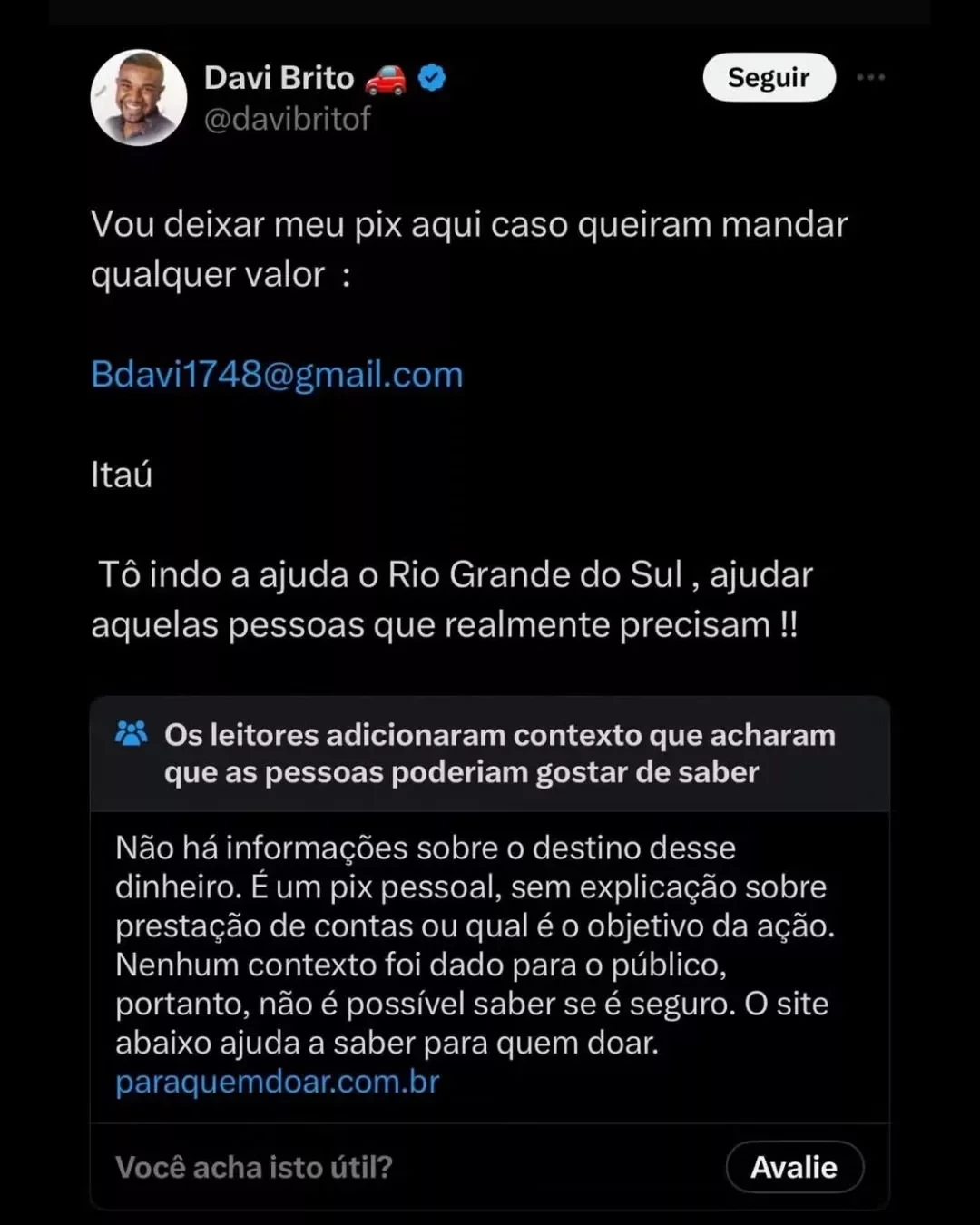 "Não há informações sobre o destino desse dinheiro. É um pix pessoal, sem explicação sobre prestação de contas ou qual é o objetivo da ação. Nenhum contexto foi dado para o público, portanto, não é possível saber se é seguro. O site abaixo ajuda a saber para quem doar", diz o comunicado da plataforma, incluindo um endereço verificado.