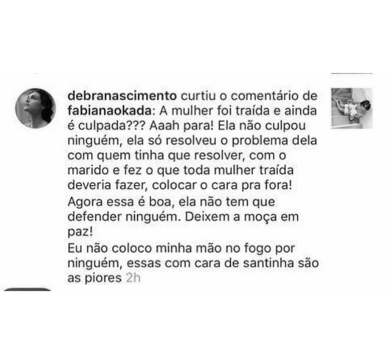 Nesta quinta-feira, 21, a mãe de Bella, de 10 meses, curtiu um texto que uma internauta escreveu em sua última foto. "A mulher foi traída e ainda é culpada? Aaah para! Ela não culpou ninguém, ela só resolveu o problema dela com quem tinha que resolver, com o marido e fez o que toda mulher traída deveria fazer, colocar o cara pra fora! Agora essa é boa, ela não tem que defender ninguém. Deixem a moça em paz! Eu não coloco minha mão no fogo por ninguém. Essas com cara de santinha são as piores", falava o comentário.