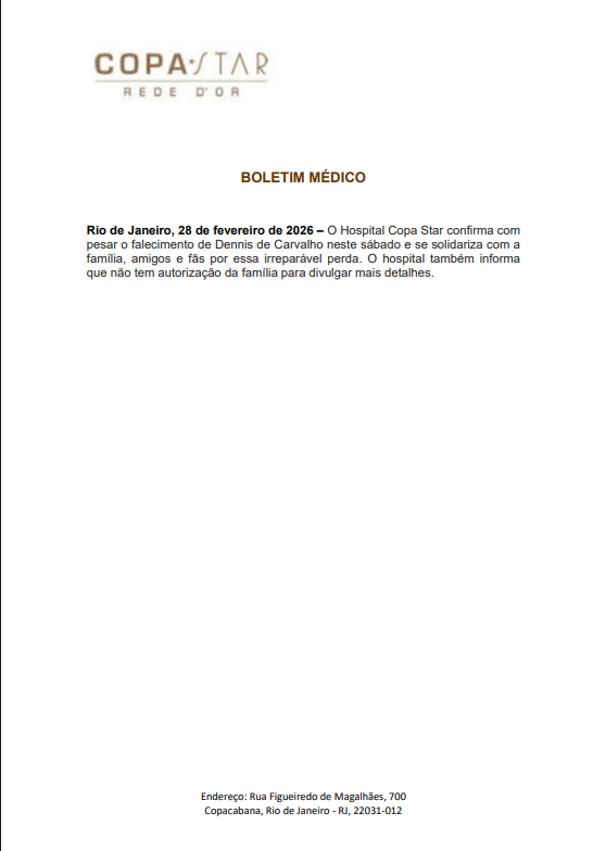 Em nota enviada à imprensa, o hospital informou: “O Hospital Copa Star confirma com pesar o falecimento de Dennis de Carvalho neste sábado e se solidariza com a família, amigos e fãs por essa irreparável perda. O hospital também informa que não tem autorização da família para divulgar mais detalhes”.
