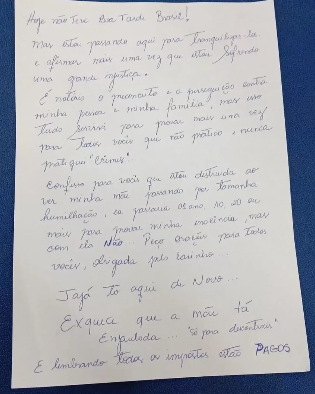 "Hoje não Teve Boa Tarde Brasil! Mas estou passando aqui para tranquilizá-los e afirmar mais uma vez que estou sofrendo uma grande injustiça. É notório o preconceito e a perseguição contra minha pessoa e minha família, mas isso tudo servirá para provar mais uma vez para lados vocês que não pratico e nunca pratequei 'Crimes'", iniciou a carta