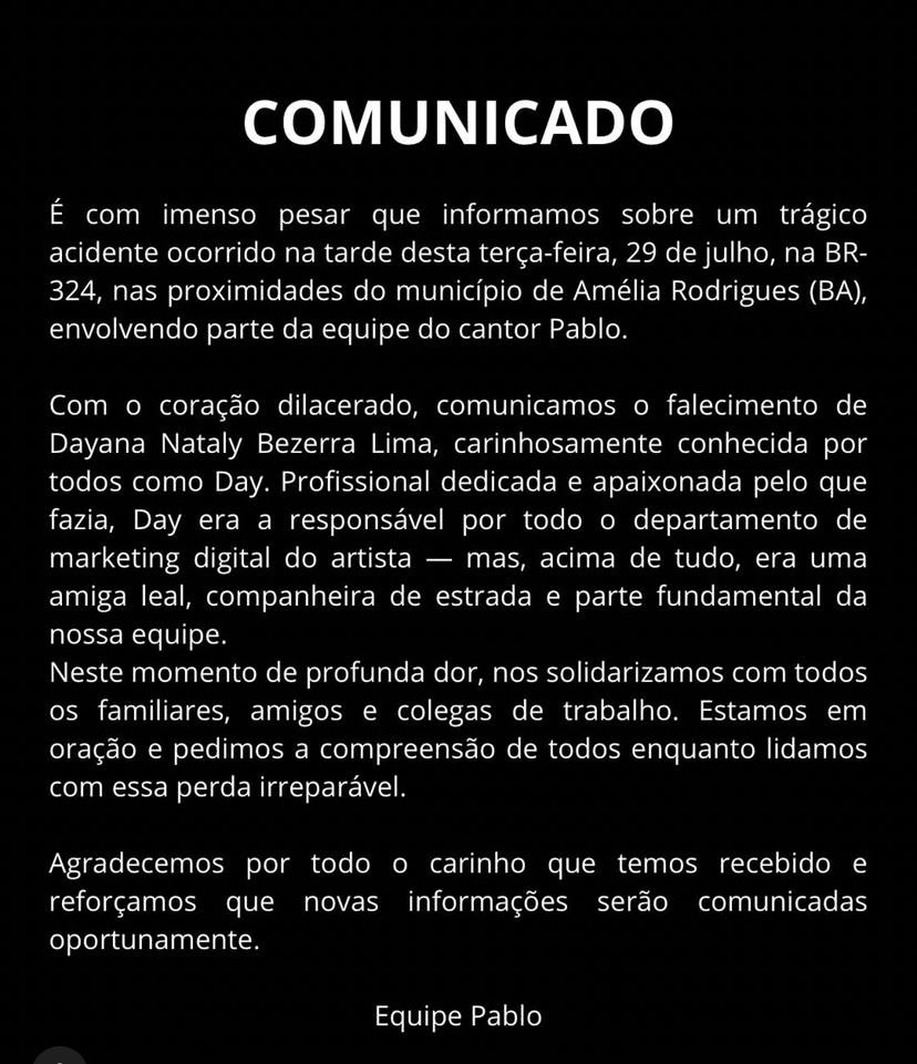 Segundo o comunicado, além de responsável por todo o departamento de marketing digital do artista, Dayana era, acima de tudo, uma amiga leal, companheira de estrada e parte fundamental da equipe.