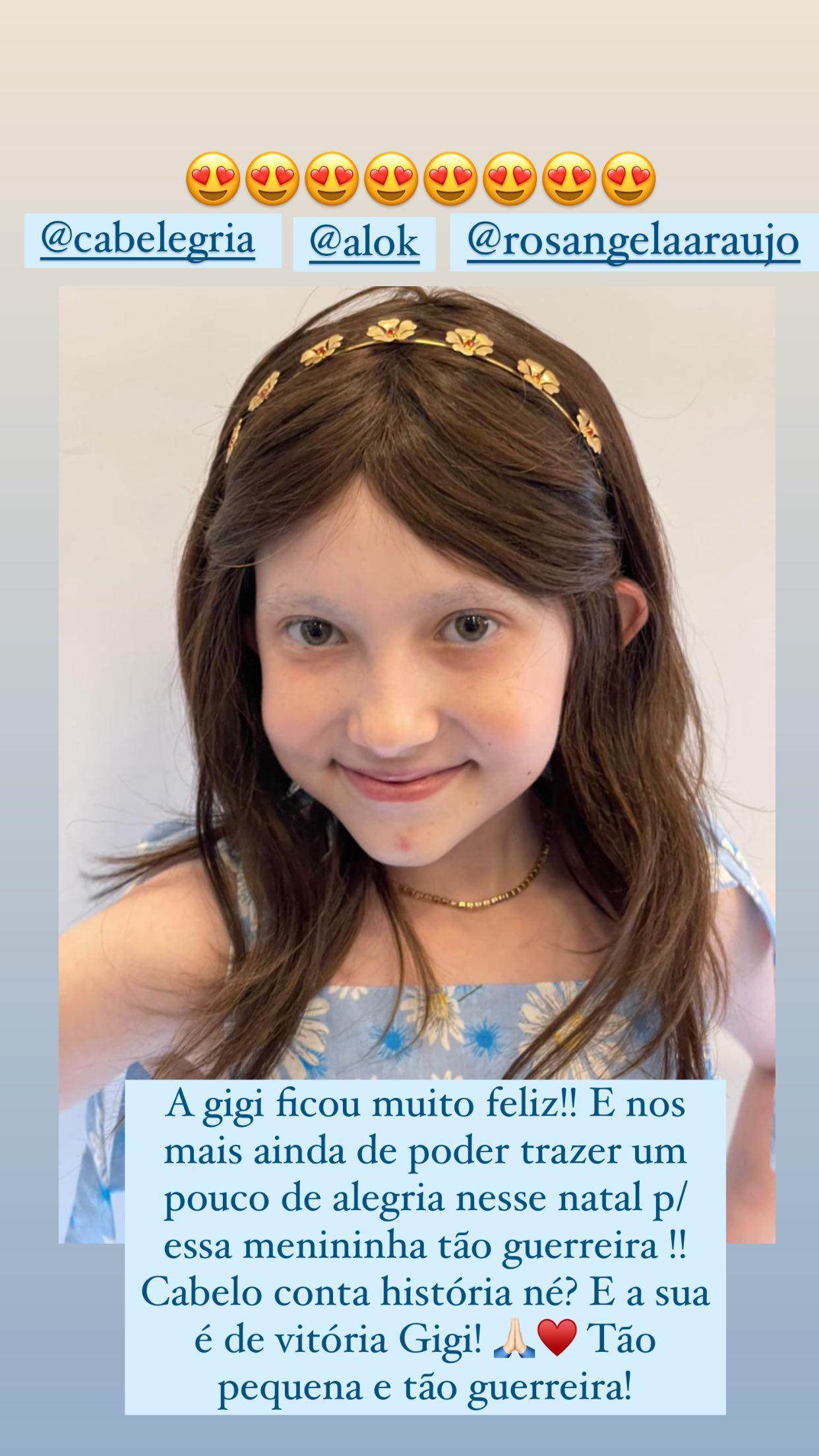 A influenciadora, então, mostrou a pequena Giovana usando a peruca e se derreteu de amores. "A Gigi ficou muito feliz! E nós mais ainda de poder trazer um pouco de alegria nesse Natal para essa menininha tão guerreira! Cabelo conta história, né? E a sua é de vitória, Gigi. Tão pequena e tão guerreira", finalizou.