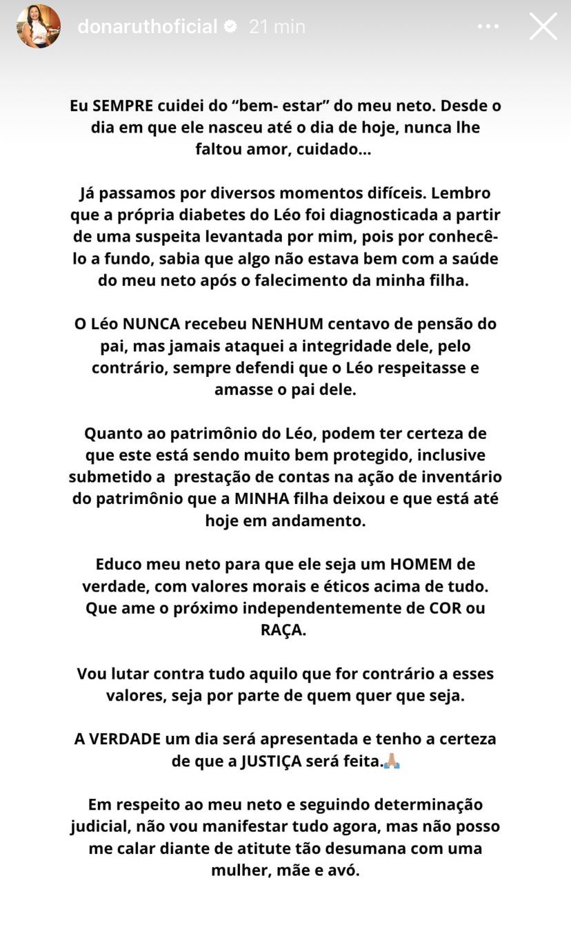 Através dos Stories do Instagram, a mãe de Marília Mendonça escreveu: "Eu sempre cuidei do bem- estar do meu neto. Desde o dia em que ele nasceu até o dia de hoje, nunca lhe faltou amor, cuidado... Já passamos por diversos momentos difíceis. Lembro que a própria diabete do Léo foi diagnosticada a partir de uma suspeita levantada por mim, pois por conhecê-lo a fundo, sabia que algo não estava bem com a saúde do meu neto após o falecimento da minha filha'', iniciou.