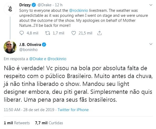 Drake pediu desculpas em sua conta no Twitter por não permitir que seu show fosse transmitido ao vivo pela Multishow. Ele culpou a chuva pela decisão, mas, segundo o diretor Boninho, parece que não foi bem assim que as coisas aconteceram. As informações são da Quem
