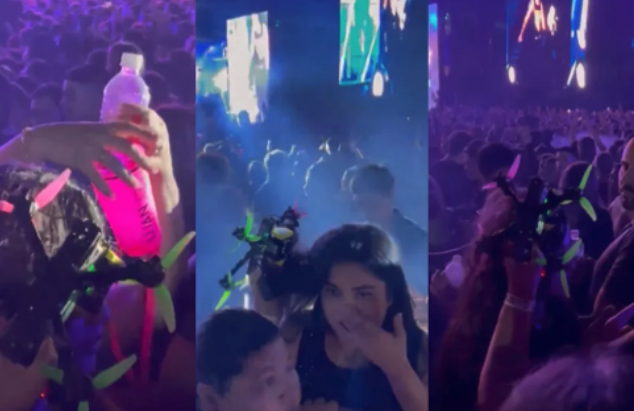 Em um vídeo que circula na internet, é possível ver a mulher com o drone enroscado no cabelo enquanto Luan canta o hit "Meteoro da Paixão".