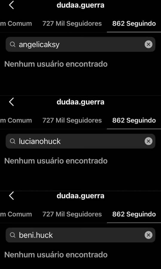 Duda Guerra, de 16 anos, deixou de seguir Angélica e Luciano Huck nesta sexta-feira (9), após o término de seu relacionamento com Benício Huck, de 17, filho do casal. Antes disso, a jovem já havia apagado as fotos com o ex-namorado de suas redes sociais, e os dois também deixaram de se seguir mutuamente. Apesar do rompimento, os apresentadores continuam seguindo a ex-nora.