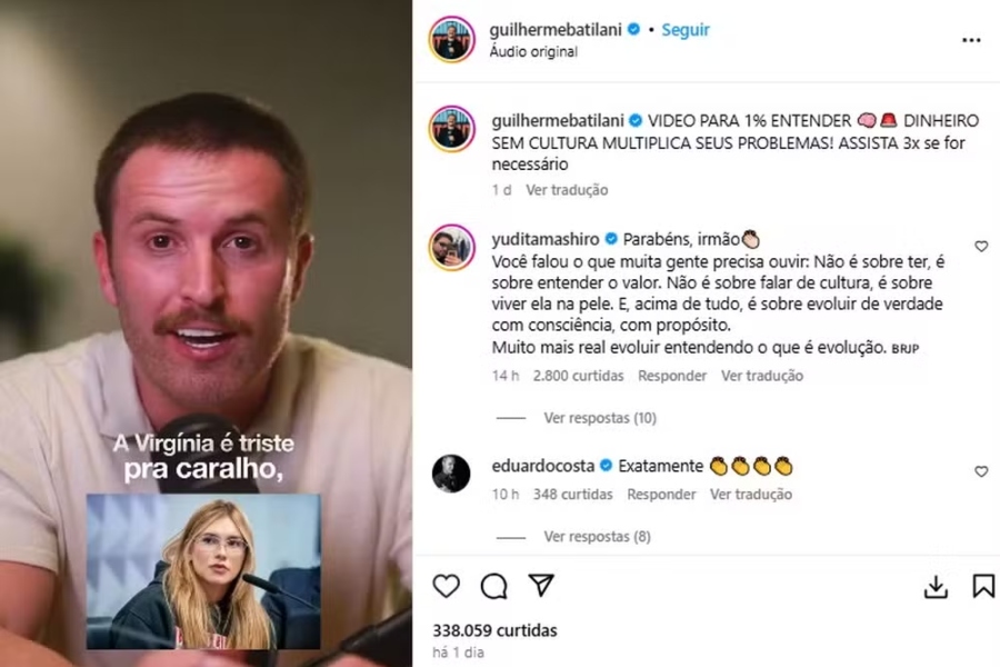 Guilherme Batilani afirmou que a empresária é ‘triste’ e sem cultura. "A Virgínia é triste pra c*ralho, visivelmente. A felicidade dela é o contrário do paradoxo da escolha. Ela tem muitas opções e baixo intelecto e nível cultural para contemplar as opções. Quanto mais opções, mais travado e infeliz você fica", opinou.