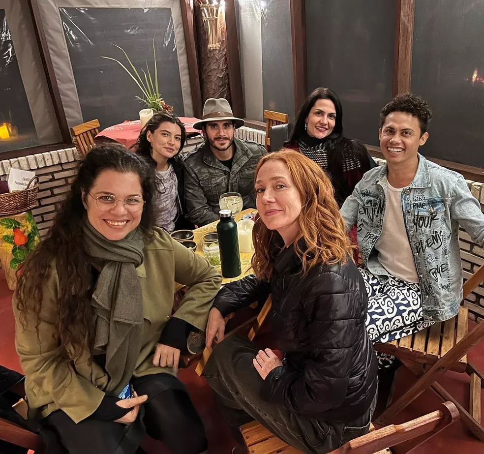O chef de cozinha Thiago Melo compartilhou também um registro de parte do elenco de Pantanal. Na imagem estão Silvero Pereira (Zaquieu), Alanis Guillen (Juma), Marcos Palmeira (José Leôncio) e Isabel Teixeira (Maria Bruaca). "Parte do elenco da novela 'Pantanal' despedindo da fazenda Barranco Alto. Gratidão", escreveu ele.