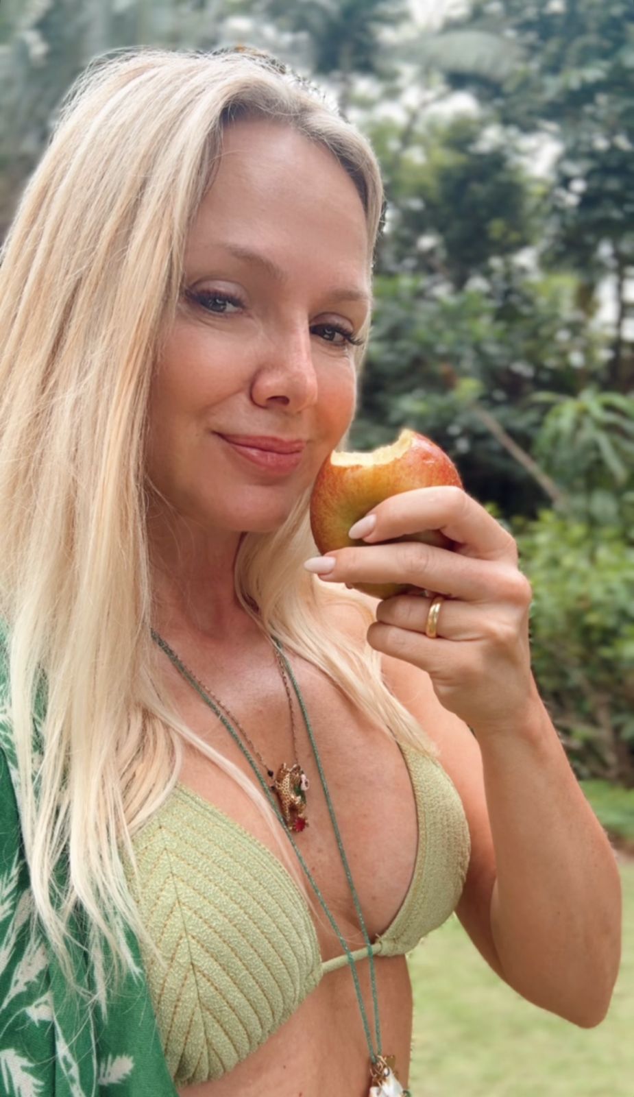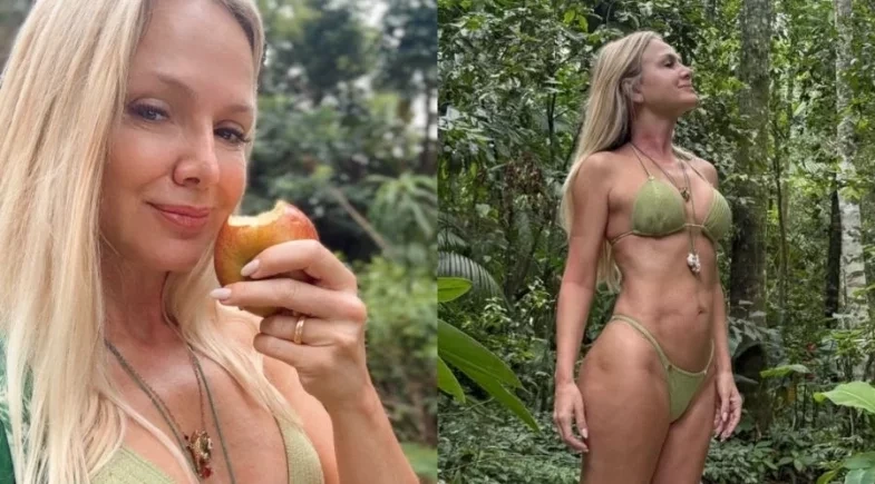 No registro publicado nas redes sociais, a comunicadora usou um biquíni verde texturizado e posou comendo um fruto direto do pé. A boa forma da apresentadora não passou despercebida e rendeu uma série de elogios de fãs e amigos.