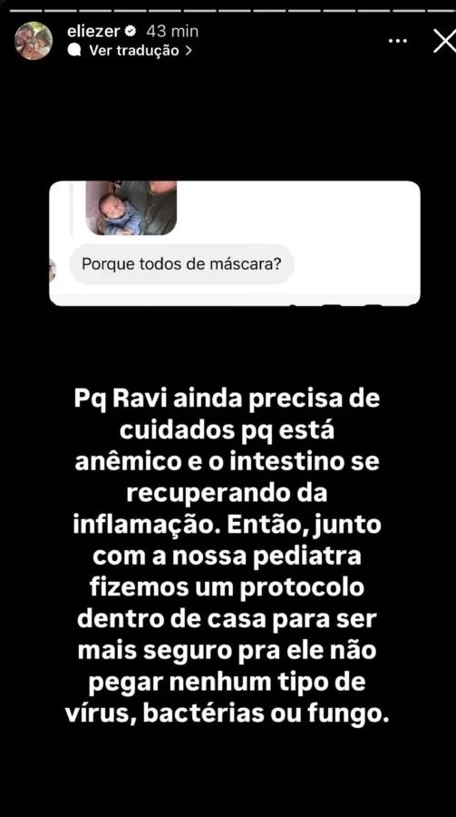 "Porque o Ravi ainda precisa de cuidados, porque está anêmico e o intestino está se recuperando da inflamação. Então, junto com a nossa pediatra, fizemos um protocolo dentro de casa para ser mais seguro para ele e não pegar nenhum tipo de vírus, bactéria ou fungo", explicou o ex-BBB.