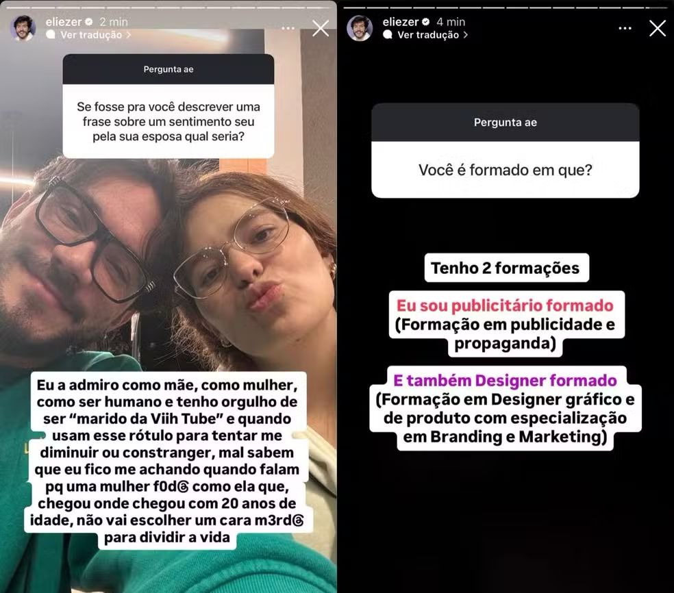 Pai de Lua, de 2 anos, e Ravi, de sete meses, Eliezer também destacou sua trajetória pessoal e profissional antes da fama, mencionando suas experiências internacionais e sua formação acadêmica. “Tenho formação em publicidade e propaganda e formação em design gráfico e produto com especialização em branding e marketing”, completou.