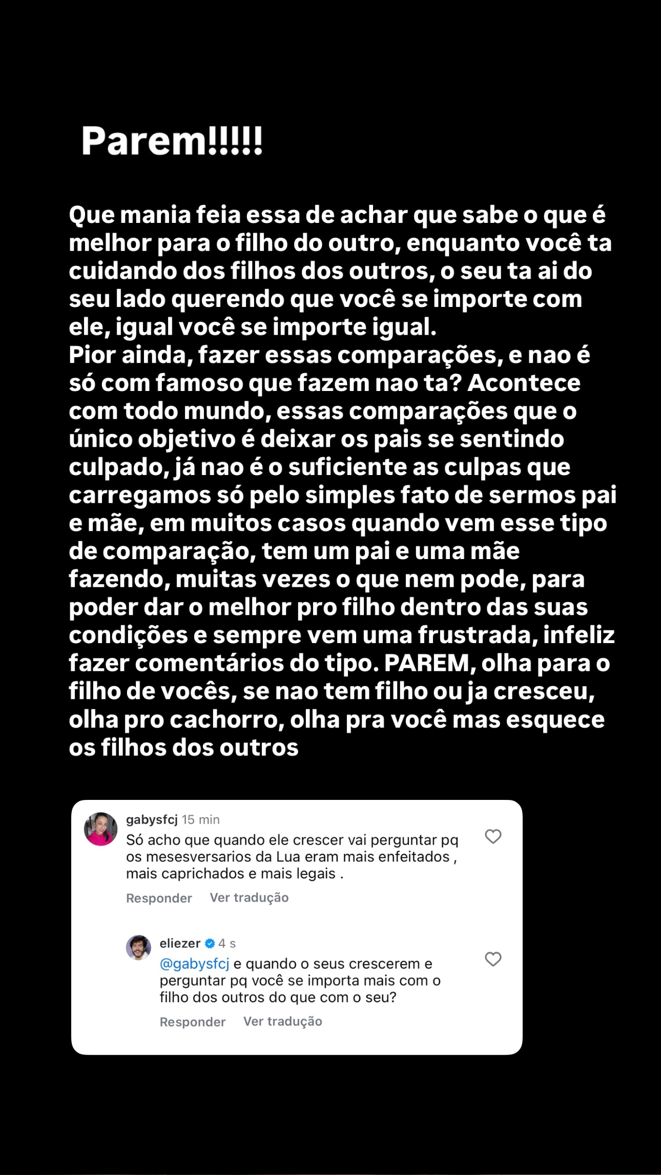 O ex-BBB Eliezer usou suas redes sociais nesta quinta-feira (17) para responder o comentário de um internauta sobre os mêsversários dos filhos Lua e Ravi. Um usuário afirmou que as festas da primogênita do casal eram maiores do que as feitas para o caçula, e o influenciador não gostou.