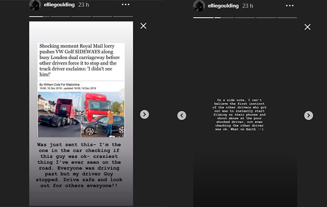 De acordo com o portal The Sun, um Golf VW preto e um caminhão vermelho do Royal Mail colidiram em uma estrada na região noroeste de Londres. A artista esteve presente no local no momento do acidente e imediatamente saiu do carro em que estava e correu para ajudar o motorista. A situação foi gravada e divulgada por uma pessoa que reconheceu Ellie.