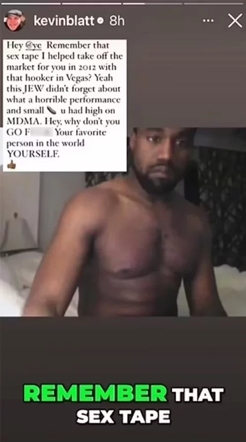 Segundo o promotor, Kanye teria pago cerca de US$ 250 mil, equivalente a R$ 1,4 milhão, para retirar o vídeo íntimo de circulação. No suposto registro de 2012, o rapper aparece drogado fazendo sexo com uma prostituta. Blatt fez duras críticas ao cantor em seus stories enquanto compartilhava um trecho do suposto vídeo, relembrando a situação que teria ocorrido em Las Vegas, na qual Kanye estaria sob efeito de MDMA.