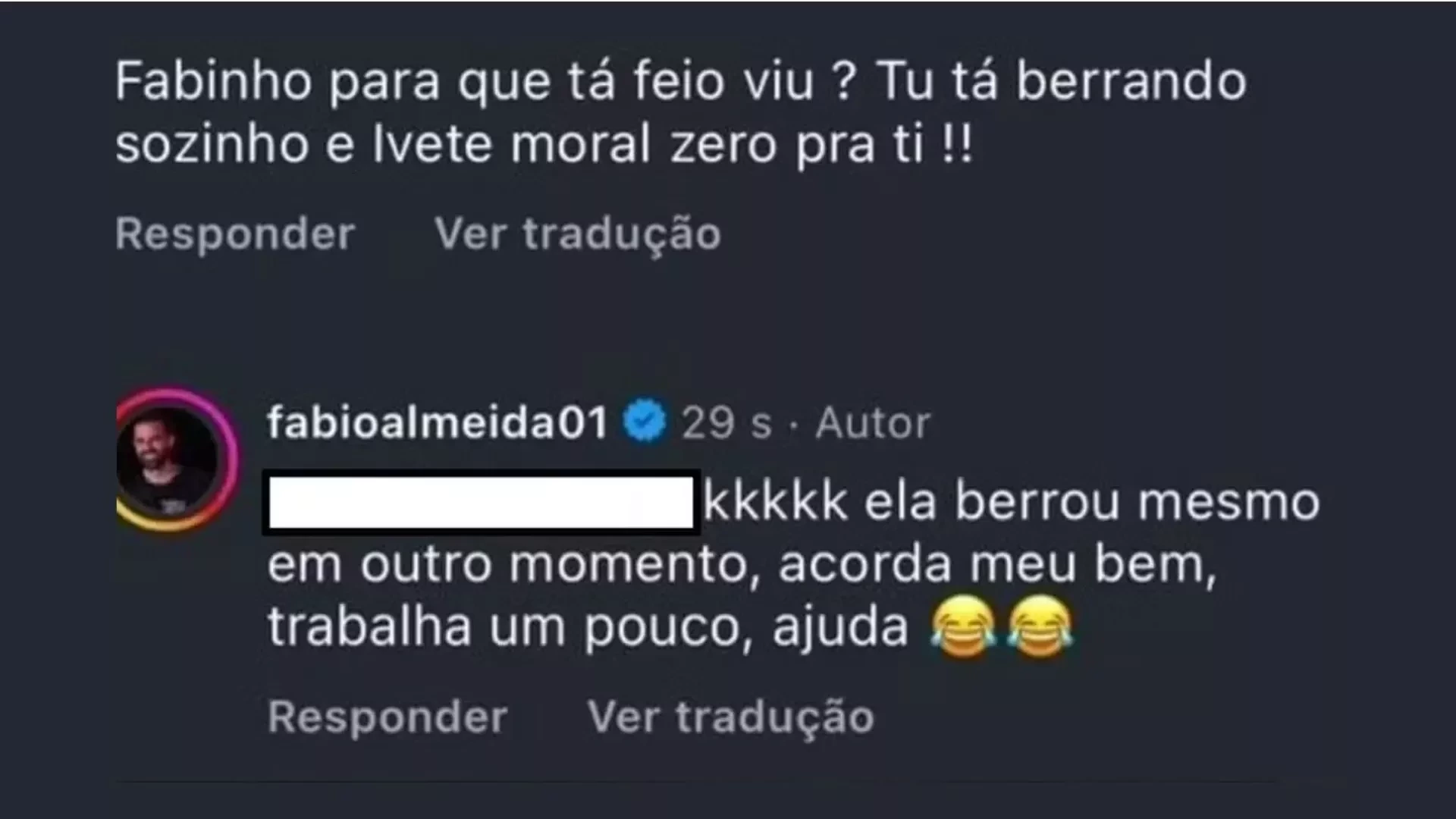 Um seguidor rebateu: "Fábio, você está gritando sozinho, e Ivete não está te dando atenção." Ele respondeu: "Ela gritou em outro momento (risos). Acorda, querido." Outro fã comentou: "Você ainda não superou." Fábio, mais uma vez, ironizou: "Não cancelei nenhuma turnê."