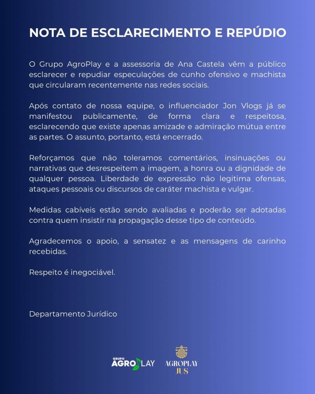 Na sequência, o Grupo AgroPlay e a assessoria de Ana Castela divulgaram uma nota de esclarecimento e repúdio. No comunicado, a equipe classificou como “especulações de cunho ofensivo e machista” as narrativas que circularam, afirmou que o assunto está encerrado após o posicionamento de Jon e destacou que “respeito é inegociável”, informando ainda que medidas cabíveis estão sendo avaliadas contra quem insistir na propagação desse tipo de conteúdo.