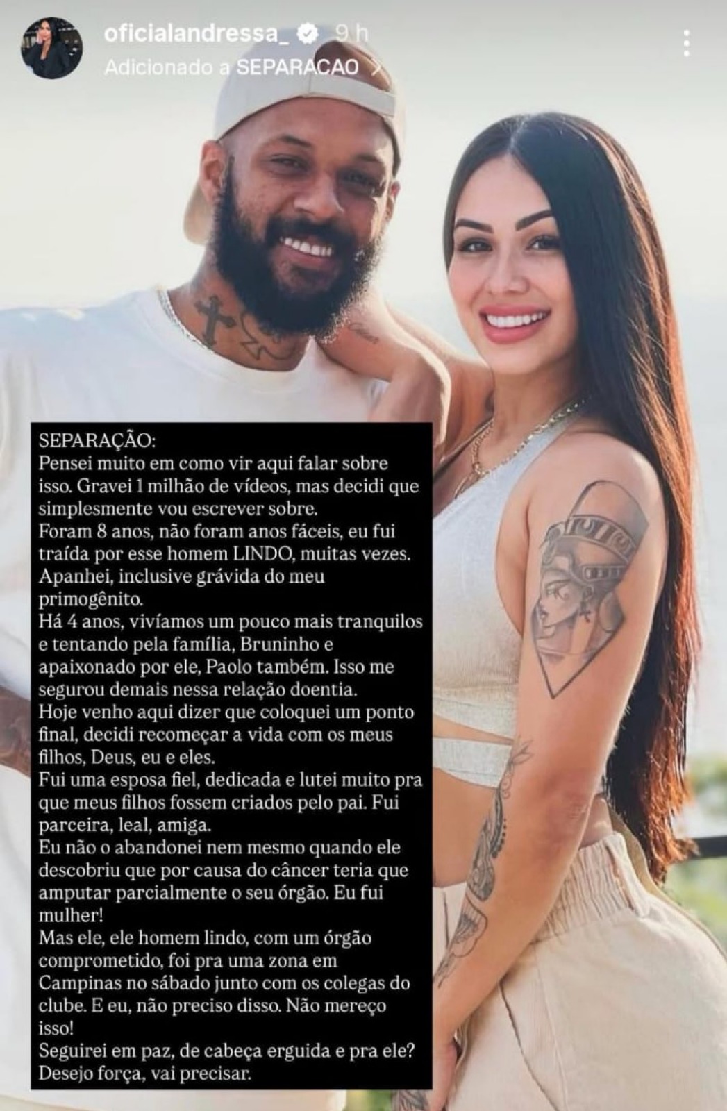 “Foram 8 anos, não foram anos fáceis, eu fui traída por esse homem LINDO, muitas vezes. Apanhei, inclusive grávida do meu primogênito..há 4 anos, vivíamos um pouco mais tranquilos e tentando pela família, Bruninho e apaixonado por ele, Paolo também. Isso me segurou demais nessa relação doentia. Hoje venho aqui dizer que coloquei um ponto final, decidi recomeçar a vida com os meus filhos, Deus, eu e eles”, diz em um trecho.