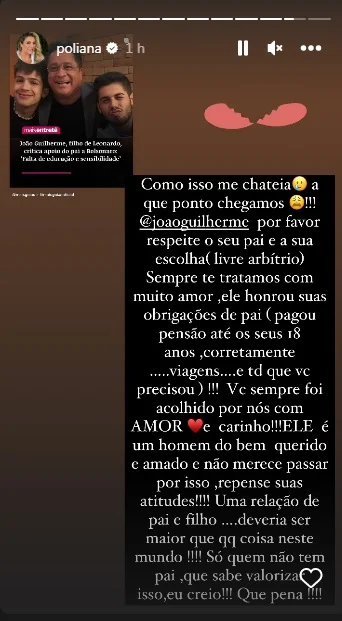 Usando uma foto de João Guilherme ao lado do pai e de Zé Felipe, seu meio-irmão, Poliana escreveu um texto onde disse estar chateada. “A que ponto chegamos! João Guilherme, por favor, respeite seu pai e a sua escolha (livre arbítrio). Sempre te tratamos com muito amor, ele honrou suas obrigações de pai, pagou pensão até os seus 18 anos corretamente, viagens e tudo o que você precisou”, diz o primeiro parágrafo.