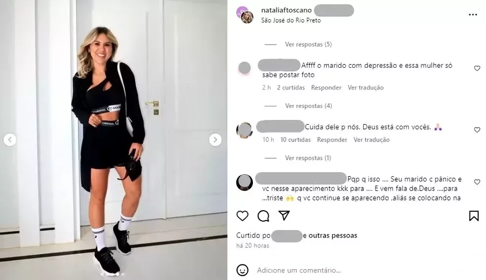 Comentários expressaram descontentamento com a escolha da influenciadora de continuar postando conteúdos relacionados ao seu trabalho enquanto o marido enfrenta problemas de saúde. "Aff, o marido com depressão e essa mulher só sabe postar foto", comentou um usuário. Outros também questionaram a postura de Toscano, alegando falta de sensibilidade.