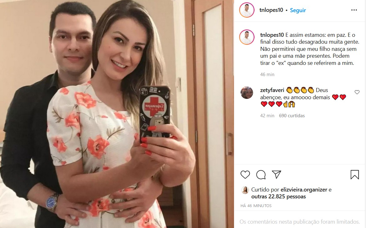 Após separação pública envolvendo polêmica e acusações de falta de auxílio, Andressa Urach e Thiago Lopes posaram juntos. O clique foi postado por ele no Instagram neste sábado (2). E assim estamos: em paz. E o final disso tudo desagradou muita gente. Não permitirei que meu filho nasça sem um pai e uma mãe presentes. Podem tirar o 'ex'quando se referirem a mim", escreveu o empresário na legenda da foto em que aparece abraçado com a mulher.