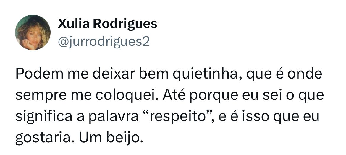 “Podem me deixar bem quietinha, que é onde sempre me coloquei. Até porque eu sei o que significa a palavra ‘respeito’, e é isso que eu gostaria. Um beijo”, escreveu a modelo no X (antigo Twitter).