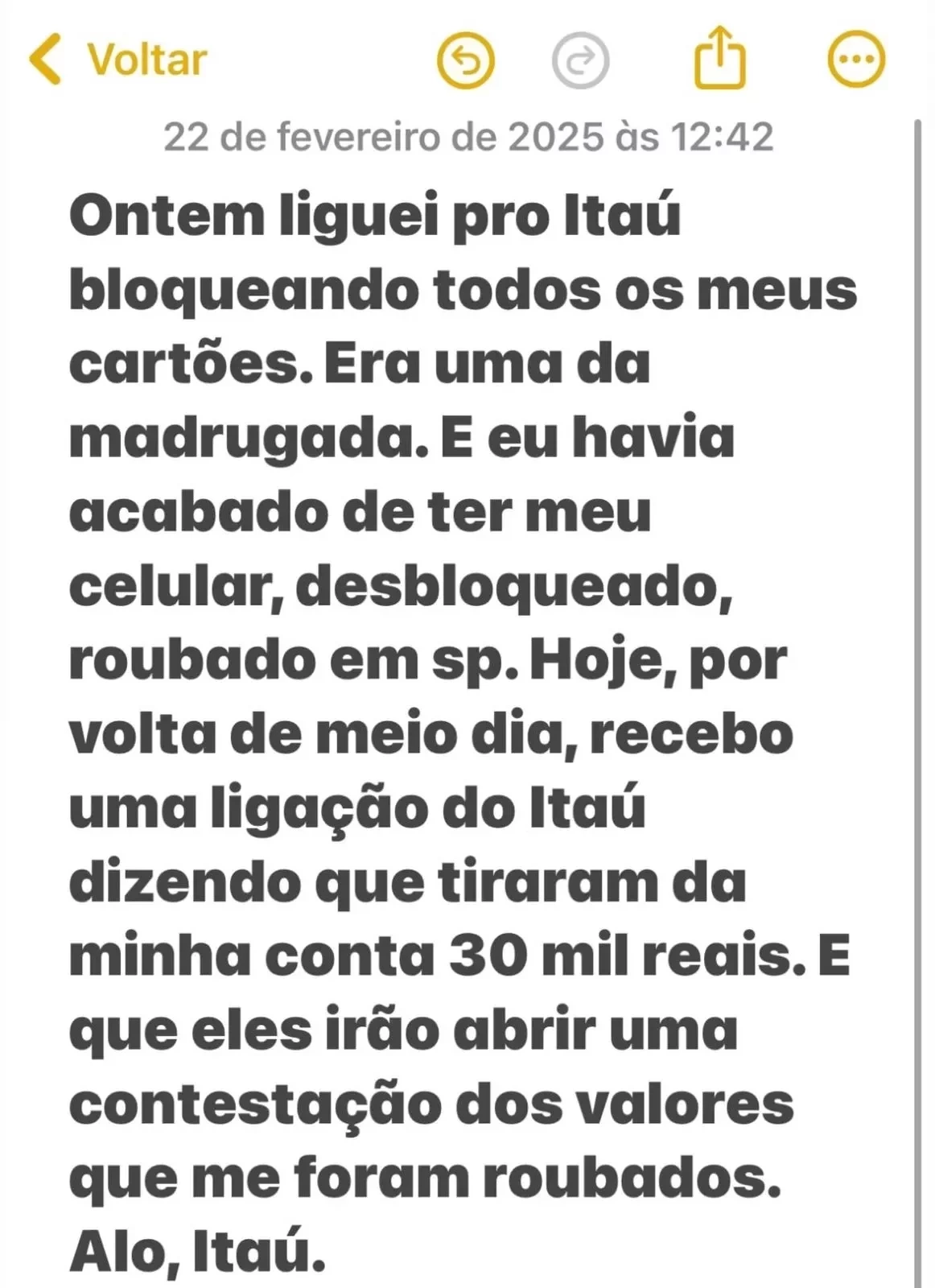 "Era uma da madrugada. E eu havia acabado de ter meu celular, desbloqueado, roubado em São Paulo. Hoje, por volta de meio dia, recebo uma ligação do Itaú dizendo que tiraram da minha conta 30 mil reais. E que eles irão abrir uma contestação dos valores que me foram roubados", disse.