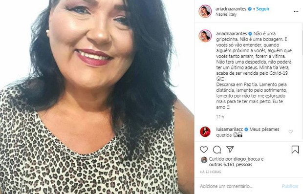 Ariadna Arantes fez um desabafo ácido em seu Facebook envolvendo sua irmã, Mari Luize, que, segundo ela, vem desrespeitando a quarentena diante da pandemia de coronavírus e colocando sua mãe e sua avó, de 80 anos de idade, em risco. A ex-BBB, que participou da décima primeira edição do reality, se mostrou preocupada, já que mora em Nápoles, na Itália, desde 2011, e não está próxima dos familiares para auxiliá-los no momento. As informações são da Quem.