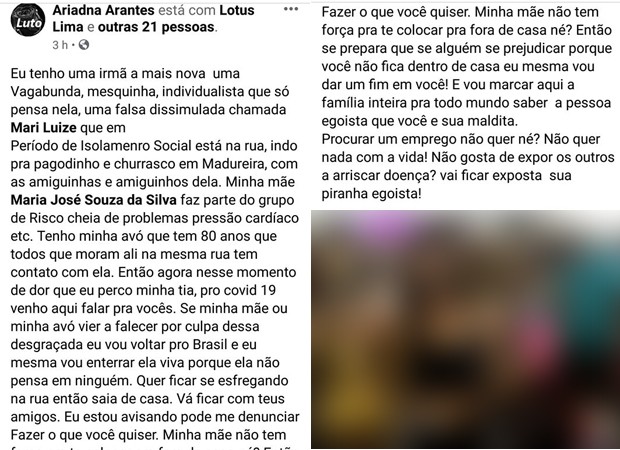 "Eu tenho uma irmã mais nova, uma vagabunda, mesquinha, individualista que só pensa nela, uma falsa dissimulada chamada Mari Luize que em período de isolamento social está na rua, indo para o pagodinho e churrasco em Madureira, com as amiguinhas e amiguinhos dela. Minha mãe, Maria José Souza da Silva, faz parte do grupo de risco e é cheia de problemas, pressão cardíaca, etc. Tenho a minha avó que tem 80 anos, que todos que moram ali na mesma rua tem contato com ela", começou a ex-BBB.