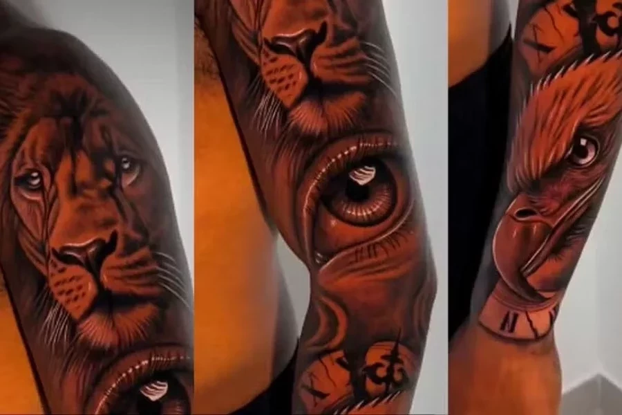 Os desenhos escolhidos pelo ex-motorista de aplicativo foram feitos em todo o braço direito, indo do início do ombro até o pulso. Ele tatuou um leão, uma águia, um olho e alguns símbolos, todos em preto e branco.