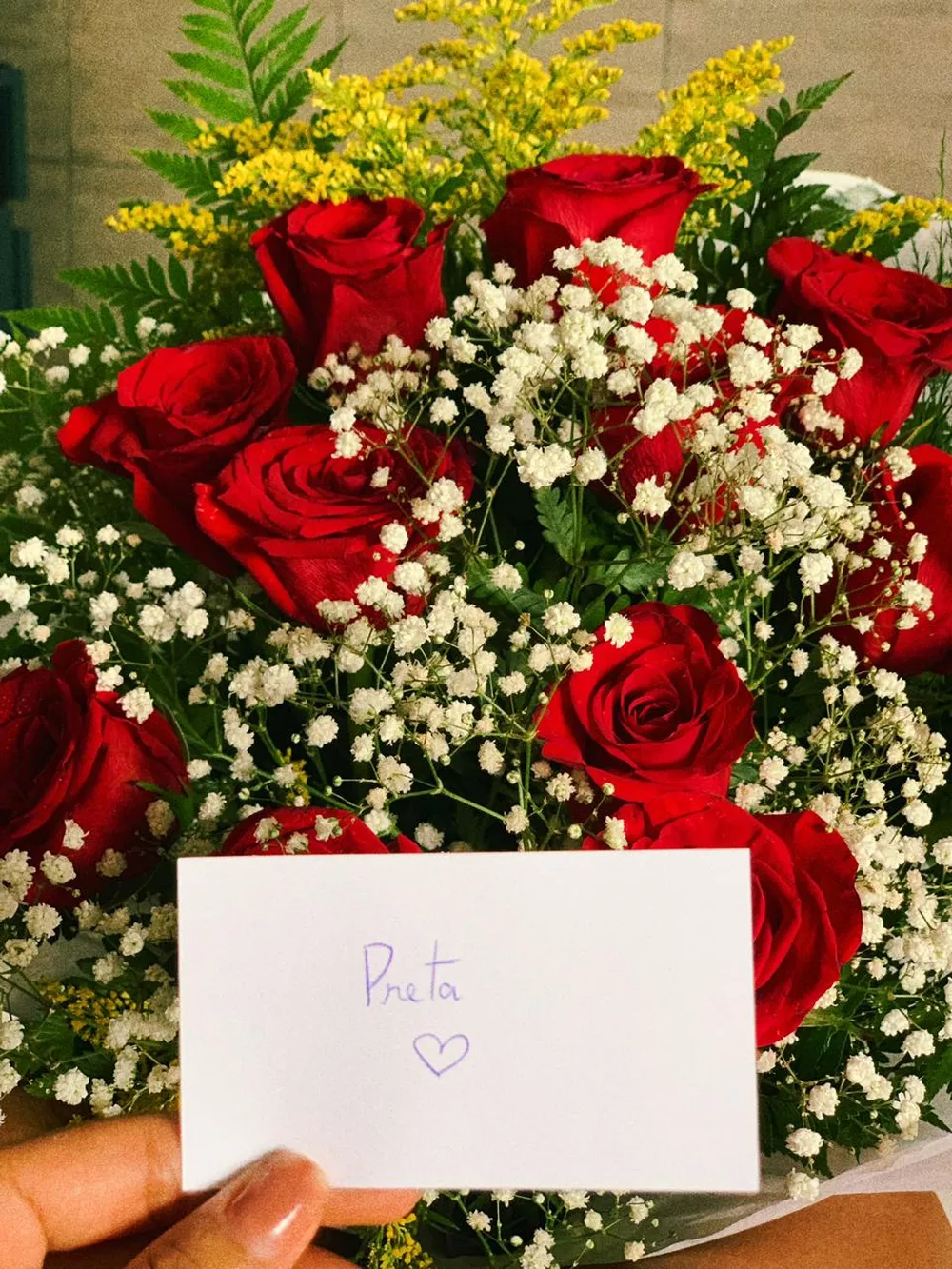 "Estamos bem, graças a Deus. Ele acabou de mandar flores aqui", disse ela. Depois de rumores do término do relacionamento tudo está lindo com direito a flores vermelhas, que significam paixão e cartãozinho romântico escrito: "Preta", apelido carinhoso de Gleici na intimidade.