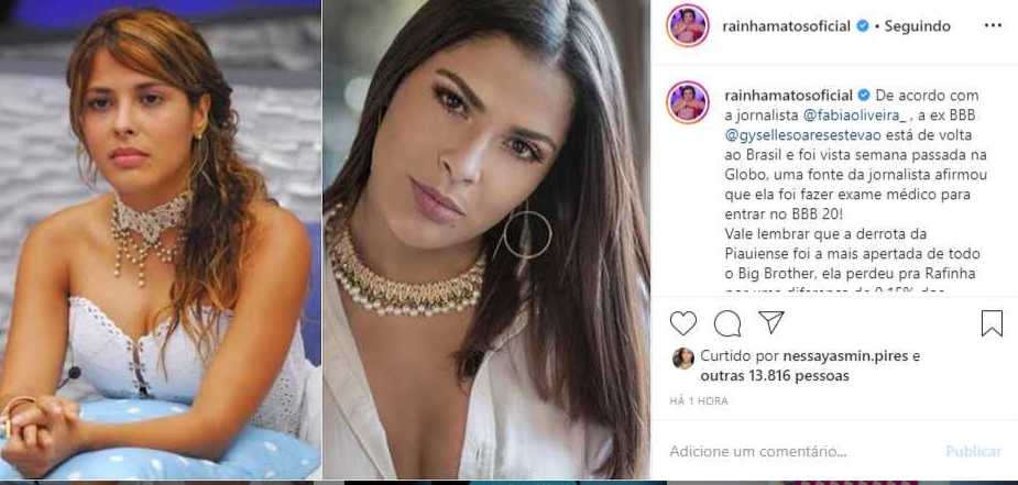 Pois bem, de acordo com a jornalista, uma fonte de sua coluna viu a celebridade nos Estúdios Globo, o antigo ‘Projac’ nesta última semana. Segundo a fonte, que jurou, Gyselle Soares foi realizar exames médicos para participar do ‘BBB 20’.