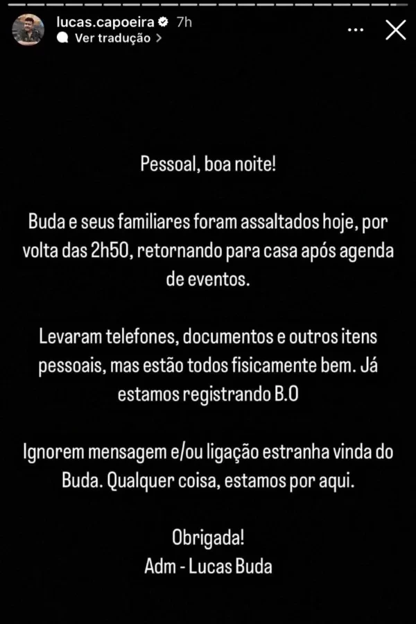 "Buda e seus familiares foram assaltados hoje, por volta das 2h50, retornando para casa após uma agenda de eventos. Levaram telefones, documentos e outros itens pessoais, mas todos estão fisicamente bem. Já estamos registrando o boletim de ocorrência. Ignorem qualquer mensagem ou ligação estranha vinda do Buda. Qualquer coisa, estamos por aqui. Obrigada. Adm - Buda", dizia a mensagem.