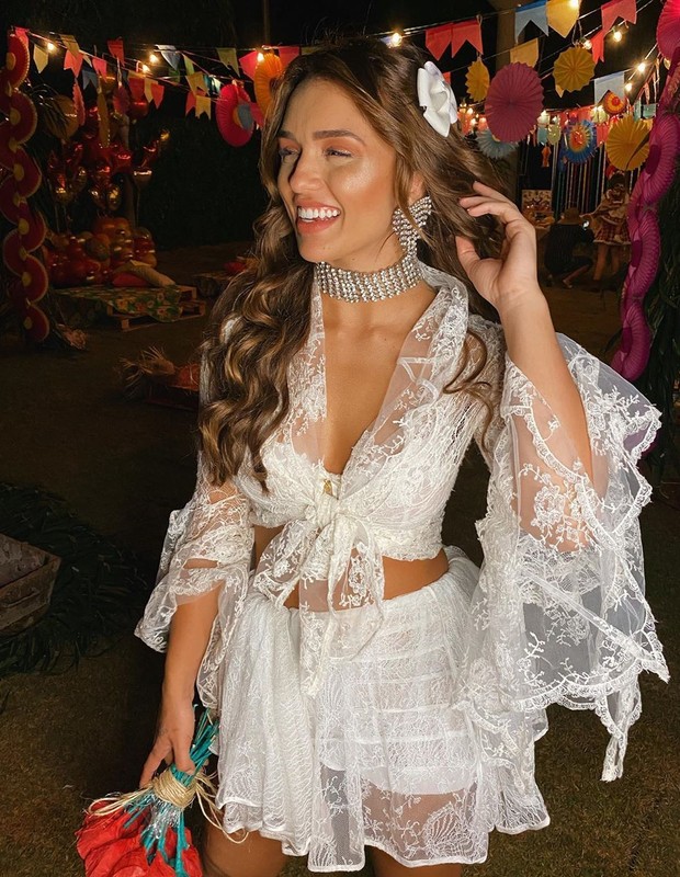 Anarriê! Rafa Kalimann mostrou aos seguidores no Instagram nesta sexta-feira (19) um pouquinho da festa junina que fez em sua chácara, em Goiânia, para comemorar o São João. Com uma roupa branca rendada, ela explicou o motivo do look: "Tô de noivinha", brincou a ex-participante do Big Brother Brasil 20. As informações são da revista Quem.