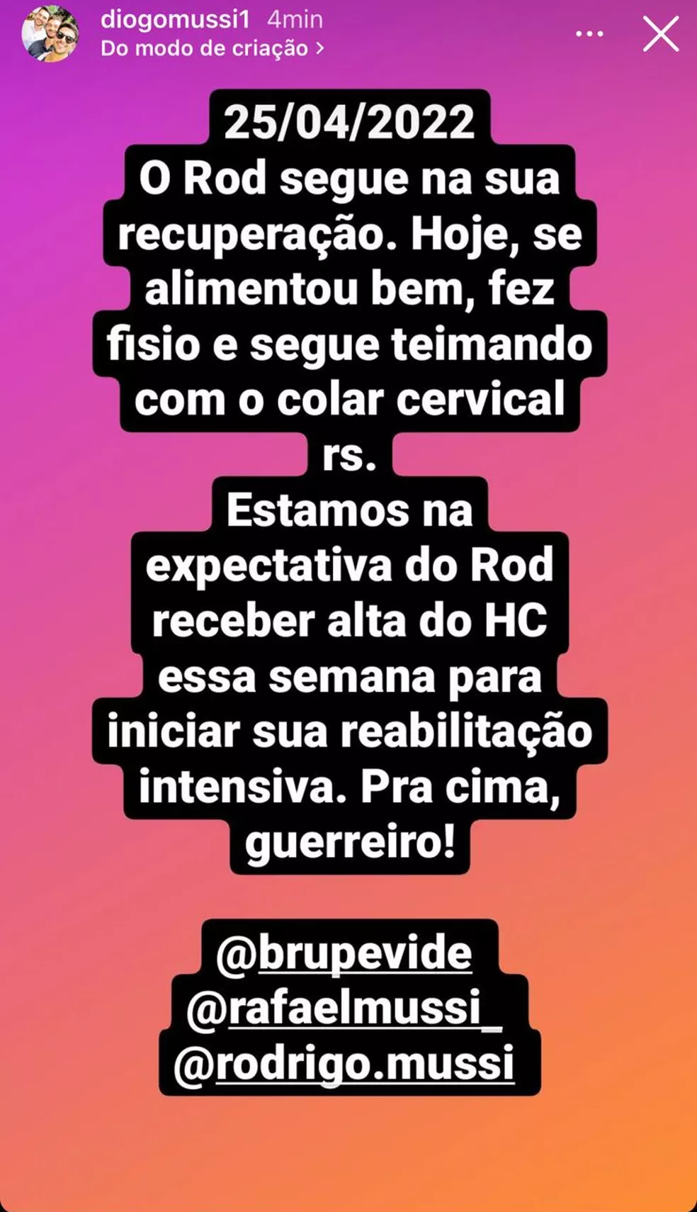 "O Rod segue na sua recuperação. Hoje, se alimentou bem, fez fisioterapia e segue teimando com o colar cervical [risos]. Estamos na expectativa do Rod receber alta do HC essa semana para iniciar sua reabilitação intensiva. Pra cima, guerreiro!"