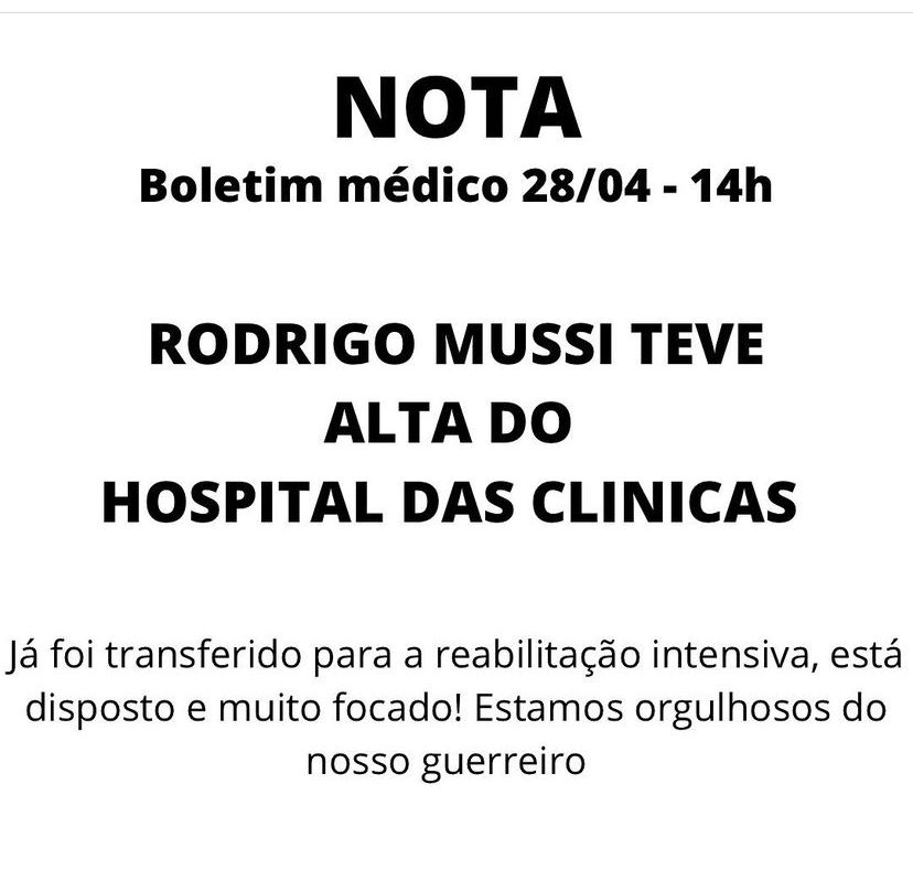 Boletim médico diz que Rodrigo Mussi recebeu alta