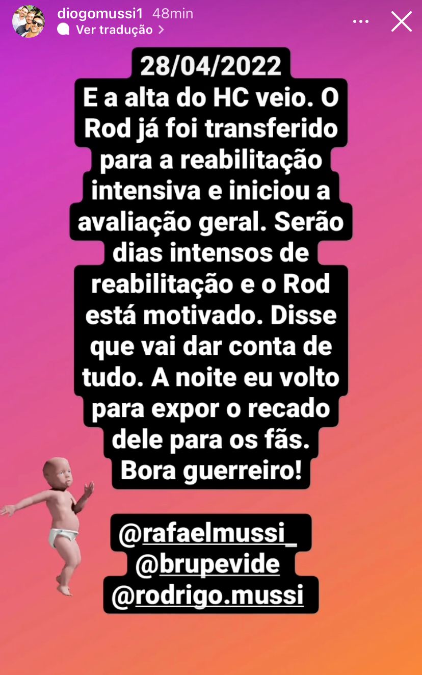 “E a alta do HC veio. O Rod já foi transferido para a reabilitação intensiva e iniciou a avaliação geral. Serão dias intensos de reabilitação e o Rod está motivado. Disse que vai dar conta de tudo. À noite eu volto para expor o recado dele para os fãs. Bora, guerreiro!”, escreveu.