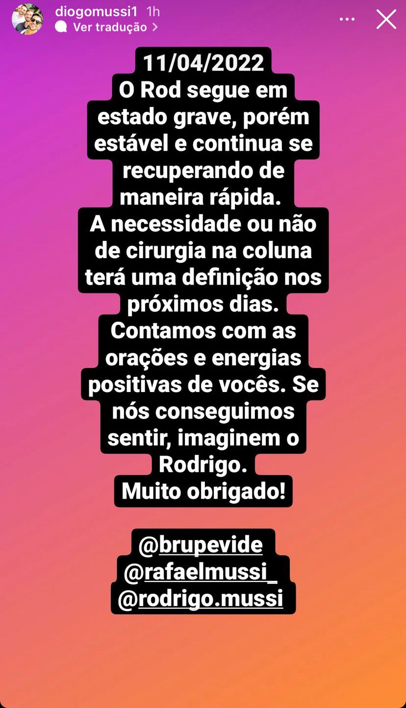 "Rod segue em estado grave, porém estável, e continua se recuperando de maneira rápida. A necessidade ou não de uma cirurgia na coluna terá uma definição nos próximos dias. Contamos com as orações e energias positivas de vocês. Se nós conseguimos sentir, imaginem o Rodrigo. Muito obrigado", escreveu o irmão do ex-brother.