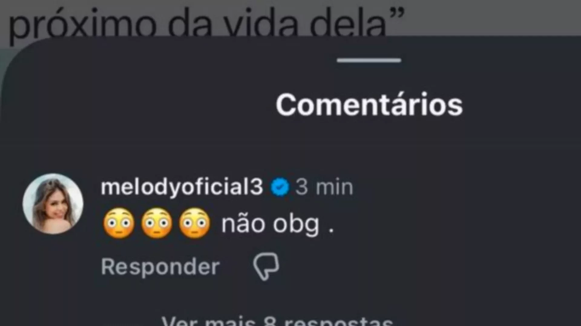 Nos comentários, internautas reagiram à resposta de Melody: “Adorei o fora”, opinou um. “Poderia ter ficado sem essa”, declarou outro. “Levanta, soldado!”, acrescentou um terceiro usuário.