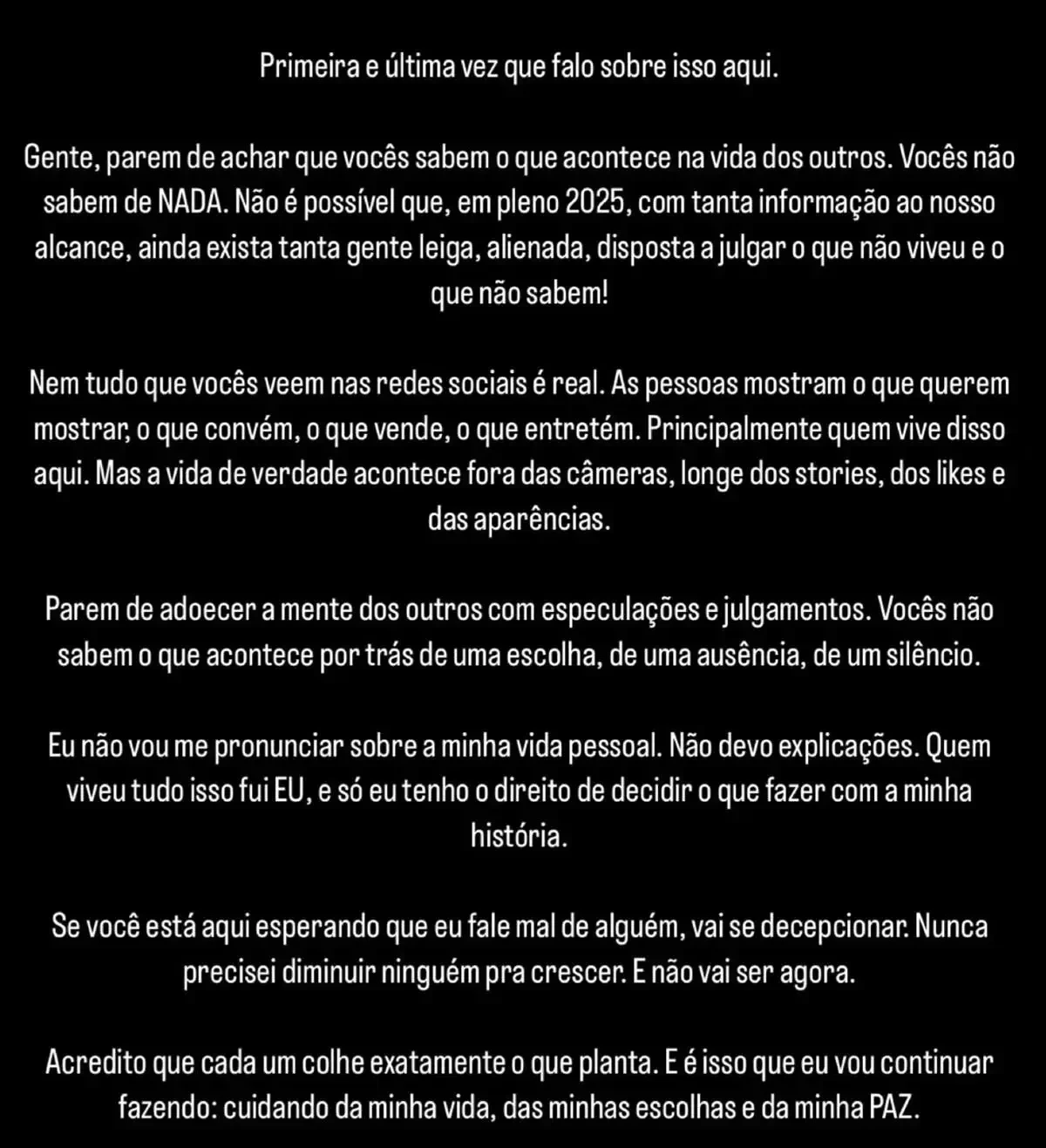 “Primeira e última vez que falo sobre isso aqui. Gente, parem de achar que vocês sabem o que acontece na vida dos outros. Vocês não sabem de nada. Não é possível que, em pleno 2025, com tanta informação ao nosso alcance, ainda exista tanta gente leiga, alienada, disposta a julgar o que não viveu e o que não sabe!”, iniciou.
