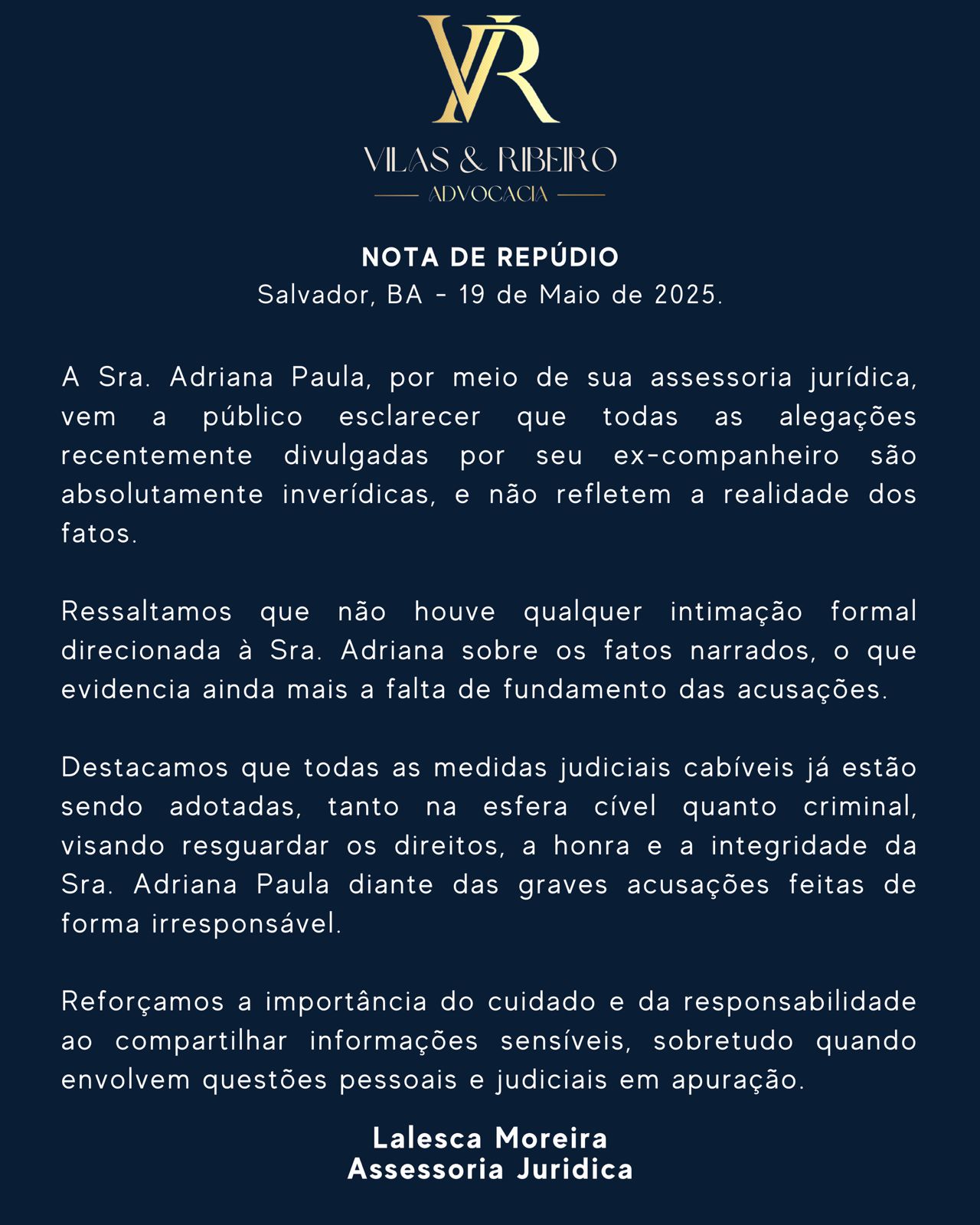 Por fim, a defesa informou que Adriana está procurando amparo na justiça: “Destacamos que todas as medidas judiciais cabíveis já estão sendo adotadas, tanto na esfera cível quanto criminal, visando resguardar os direitos, a honra e a integridade da Sra. Adriana Paula diante das graves acusações feitas de forma irresponsável”, concluiu.