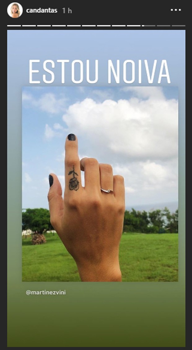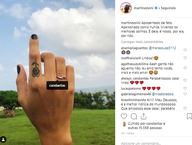 "Noiva", limitou-se a escrever ela mostrando a nmão com a aliança no anelar direito. Vinícius também disse que "está fora do mercado" após dar mais um passo na relação com a loira. "Aposentado de fato. Apaixonado como nunca. Vivendo os melhores sonhos. É dela, é nosso, por ela, por nós", declarou ele.