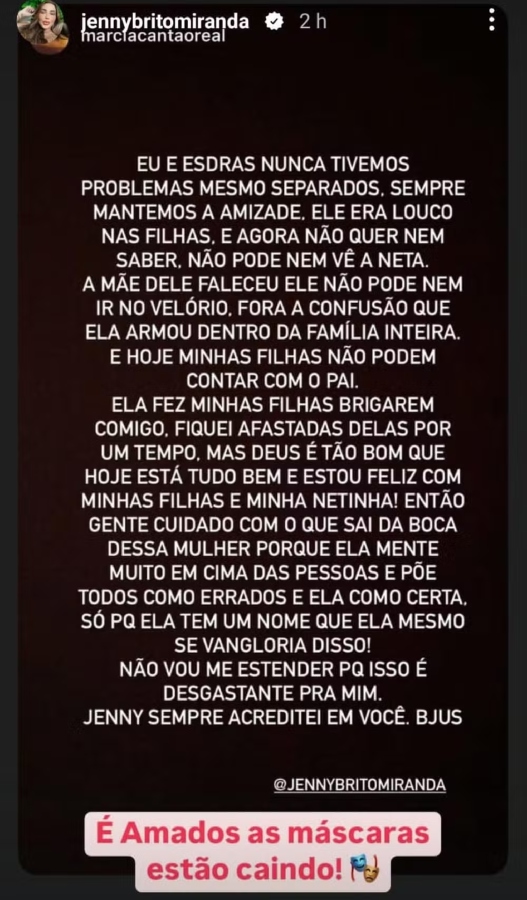"Oi, gente. Meu nome é Márcia, sou ex-esposa do Esdras. Fui casada com ele por 15 anos, temos duas filhas e uma neta. Para começar, eu vim me pronunciar porque nunca achei certo o que essa mulher fez com a Jenny, porém fiquei calada porque ainda não sabia da história. Porém, ao decorrer do tempo, vi que ela manipulava e mentia na mídia para difamar a moça. Por que falo isso? Porque ela fez o mesmo com a minha família e minhas filhas. Só Deus sabe tudo o que passamos. No começo, ela chegou até a me convidar para almoçar com ela, depois começou o inferno", disse na ocasião.