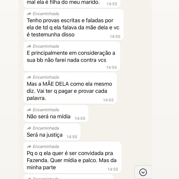 Em seguida, ela afirmou que Gretchen teria chamado uma de suas filhas de desequilibrada. "Não contente com isso, falou que a minha filha era desequilibrada e outras coisas mais. Estou aqui aguardando a intimação", provocou, compartilhando o print de parte da mensagem. "É só um pedacinho porque foram muitas barbaridades."