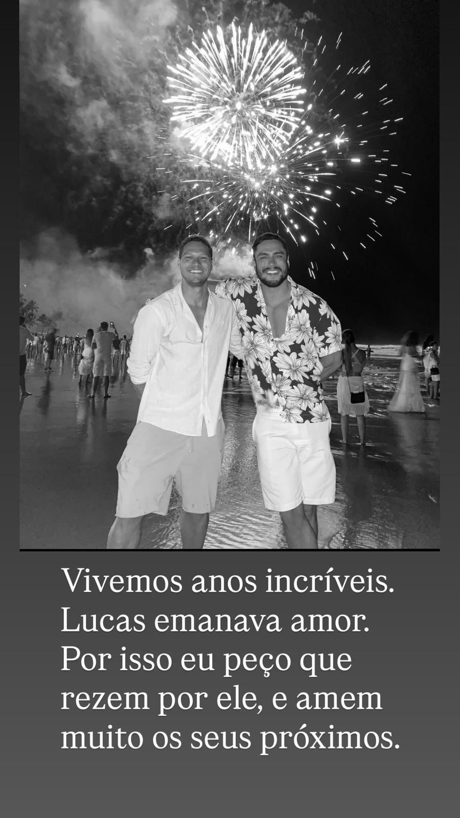 “Amigos, infelizmente perdemos o Lucas. Ele teve um mal súbito enquanto dormia e faleceu hoje de manhã. Vivemos anos incríveis, Lucas emanava amor. Por isso que eu peço que rezem por ele, e amem muito seus próximos. É um momento extremamente difícil e pessoal. Obrigado a todos por entender e respeitar’’, escreveu Correia no Instagram
