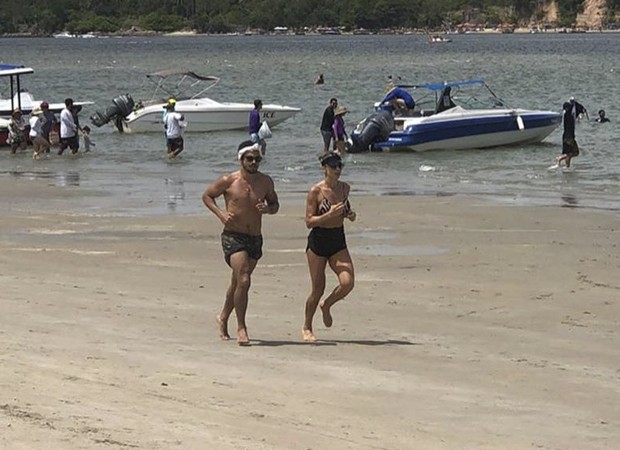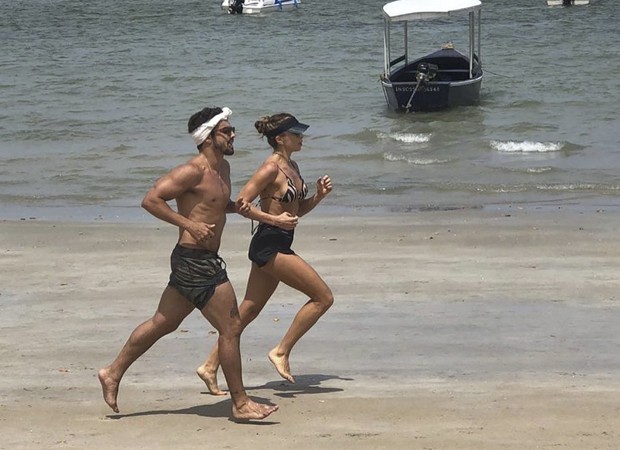 Na manhã desta terça-feira, os atores foram flagrados por uma turista durante a corrida matinal. Nas fotos postadas po @gabisantos1701, o casal aparece correndo lado a lado na beira da praia.