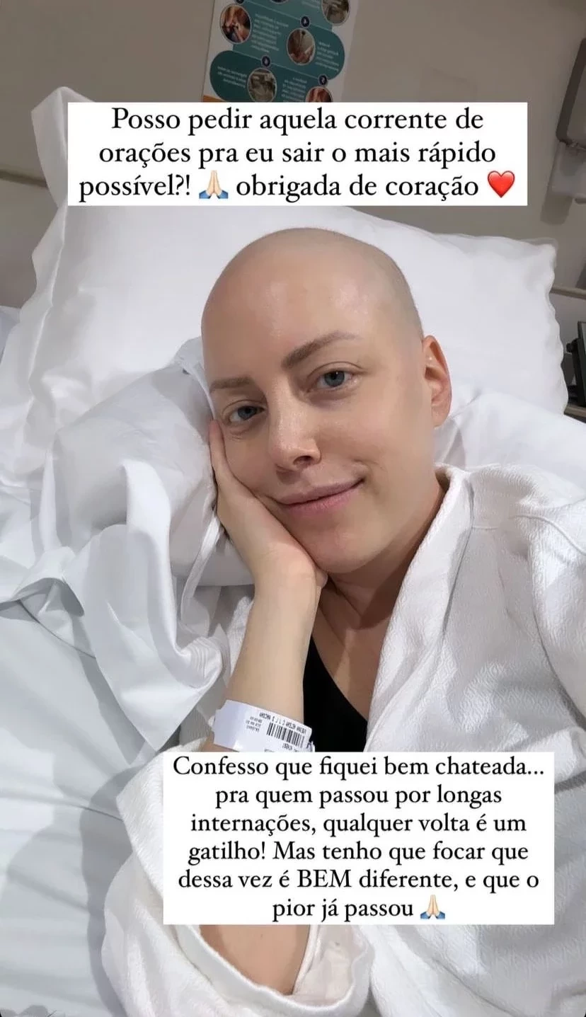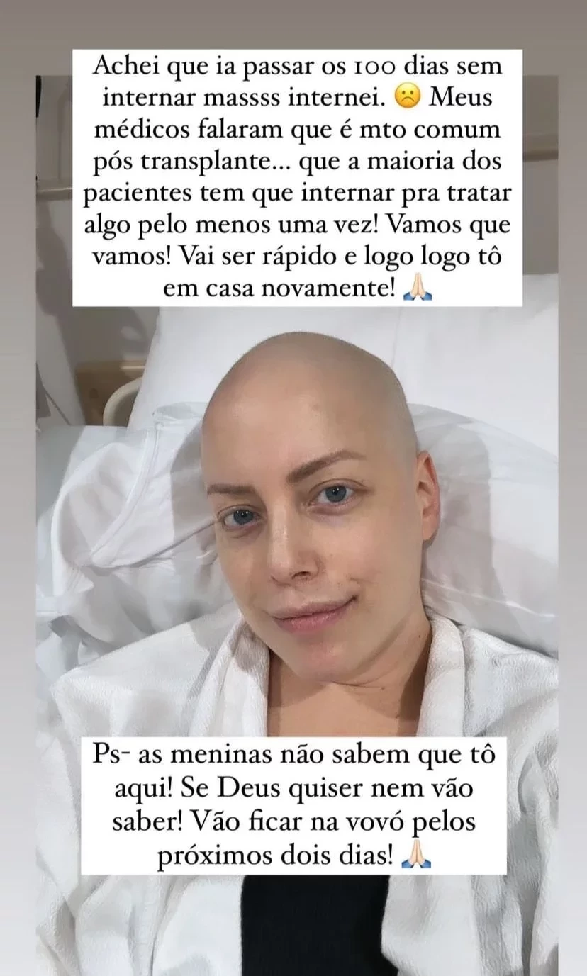 “Achei que ia passar os 100 dias sem internar, mas internei”, explica. Na sequência, ela conta: “Meus médicos falaram que é muito comum pós-transplante… que a maioria dos pacientes tem que internar para tratar algo pelo menos uma vez! Vamos que vamos! Vai ser rápido e logo, logo estou em casa novamente!”.